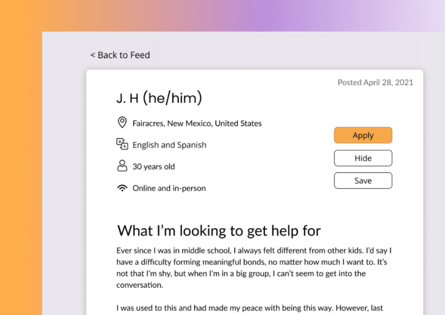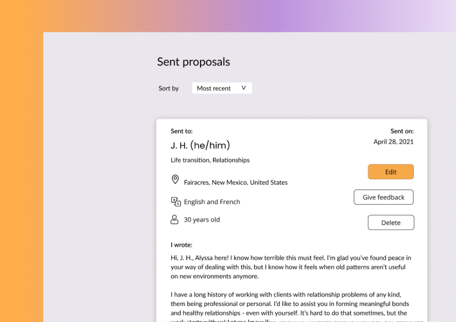 Find clients that you think are the right fit for you and apply to become their therapist. By clicking on the post, the client's profile will expand and show you additional information. If you think you're able to help, send in a proposal!