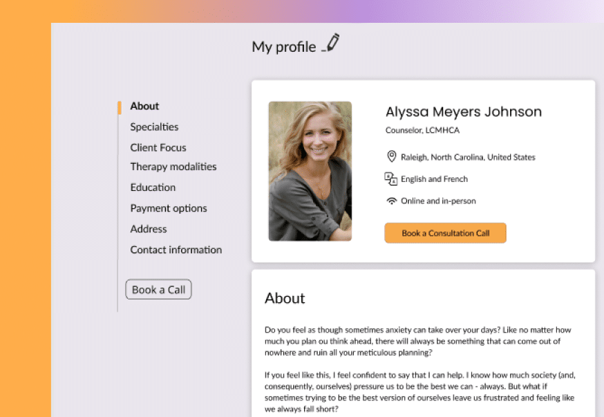 Create a profile by answering questions about your practice. It's time to tell us about your qualifications, specialties, and show your style as a therapist! This information is essential for prospective clients to get to know you better.